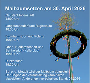 Bei o. g. Uhrzeit wird der Maibaum aufgestellt. Der Beginn der Veranstaltung kann davon abweichen. Änderungen vorbehalten, Stand: 04/2026