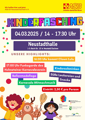 eine gemeinsame Veranstaltung des ASB-Mehrgenerationenhaus und der Neustadthalle mit Kinderschminken, Ballonmodellage, Süße Leckereien und Snacks, Karnevals-Mitmachmusik....