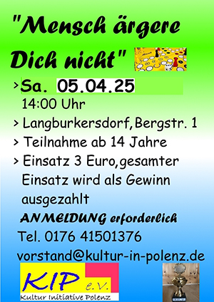 Ab 14:00 Uhr lädt die Kulturinitiative Polenz e. V. zum "Mensch ärgere dich nicht"-Turnier ein.