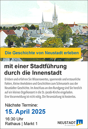 Auch 2025 bietet die Stadt Neustadt in Sachsen ihren Gästen und Einwohnern kostenlose Führungen durch die Innenstadt an. An markanten und mitunter auch an ganz unscheinbaren Orten der Innenstadt erfahren Sie Wissenswertes und Kurioses rund um Ereignisse, Personen und Gebäude der Stadt. Lassen Sie sich in vergangene Zeiten entführen: tauchen Sie ein in die geschäftsreichen 20er Jahre, das dunkle Kapitel des 2. Weltkrieges und den Wiederaufbau nach 1945. Verruchte Geschichten um Gasthöfe, Aufbegehren gegen strenge Ehefrauen, Streit um Wasser - all das erwartet Sie in den 1 ½ Stunden des gemeinsamen Rundgangs.