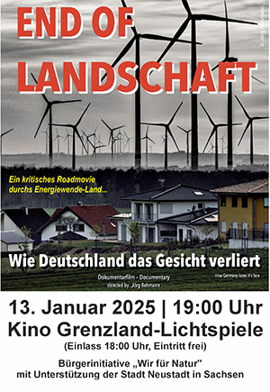 Im Rahmen der Veranstaltung wird die Kino-Dokumentation „End of Landschaft - Wie Deutschland das Gesicht verliert" von Jörg Rehmann gezeigt. Der Film dokumentiert sehr anschaulich die Vorgehensweisen und die Auswirkungen der aktuellen Energiewendepolitik mit dem Fokus auf den Ausbau der Windenergie. In Neustadt in Sachsen und den umliegenden Gemeinden sind derzeit von unterschiedlichen Investoren große Aktivitäten zur Errichtung einer Vielzahl von Windenergieanlagen zu verzeichnen. Konkret plant ein Investor auf dem Gebiet der Stadt Neustadt in Sachsen die Errichtung von sechs Anlagen mit einer Höhe von 285 Meter. Dies entspricht einer Verdreifachung der Höhe bereits bestehen-der Anlagen. Der Bau solcher Giganten hat eine tiefgreifende Veränderung unserer herrlichen Landschaft und der intakten Natur zur Folge. Sollte es zur Errichtung kommen, hat dies aufgrund der enormen Dimensionen erhebliche Auswirkungen auf das Lebensumfeld, das Wohlbefinden und die Gesundheit