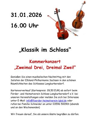 Kartenvorverkauf (Kartenpreis: 28,50 EUR) ab sofort beim Förder- und Heimatverein Schloss Langburkersdorf e. V. bei unseren Veranstaltungen oder melden Sie sich bei Interesse unter E-Mail: info@foerder-heimatverein-lgbd.de oder rufen bei Familie Schneider an unter 03596 500901 (abends und an den Wochenenden)