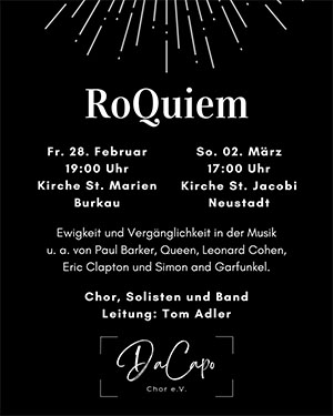 Paul Barkers preisgekröntes RoQuiem erklingt in Kombination mit Songs von Queen, Leonard Cohen, Eric Clapton, Simon and Garfunkel und anderem.