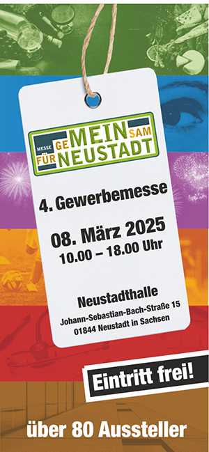 Der Verein „Gemeinsam für Neustadt“ lädt Sie zur 4.Neustädter Gewerbemesse am 8. März 2025 in die Neustadthalle ein. Eröffnet wird die Gewerbemesse 10:00 Uhr vom Bürgermeister der Stadt Neustadt in Sachsen, Peter Mühle.