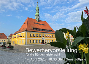 Auf der Grundlage von § 50 Absatz 2 der Gemeindeordnung für den Freistaat Sachsen hat der Stadtrat der Stadt Neustadt in Sachsen in seiner Sitzung am 12. Februar 2025 entschieden, den Bewerbern für die Bürgermeisterwahl am 18. Mai 2025 die Gelegenheit zu geben, sich in einer öffentlichen Versammlung vorzustellen.